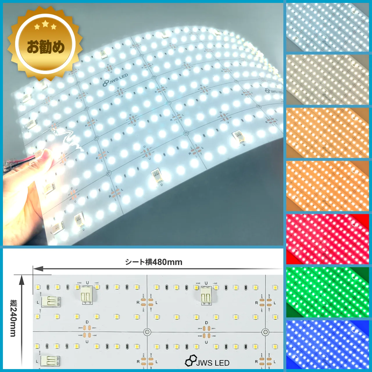 LEDシートライトはサイズ縦240 x 横480mmのフレキシブル基板に発光効率に優れた高輝度LEDを配置した照明です。明るさが強く、バックライトやキャビネット照明など幅広く応用できます。また、角形シートを連結して並べることができるので広い範囲の設置施工に適しています。シート連結に専用ハーネスは不要で標準的なケーブルが使用できます。また、シート本体は裏面両面テープで貼付けて固定をするので簡単です。