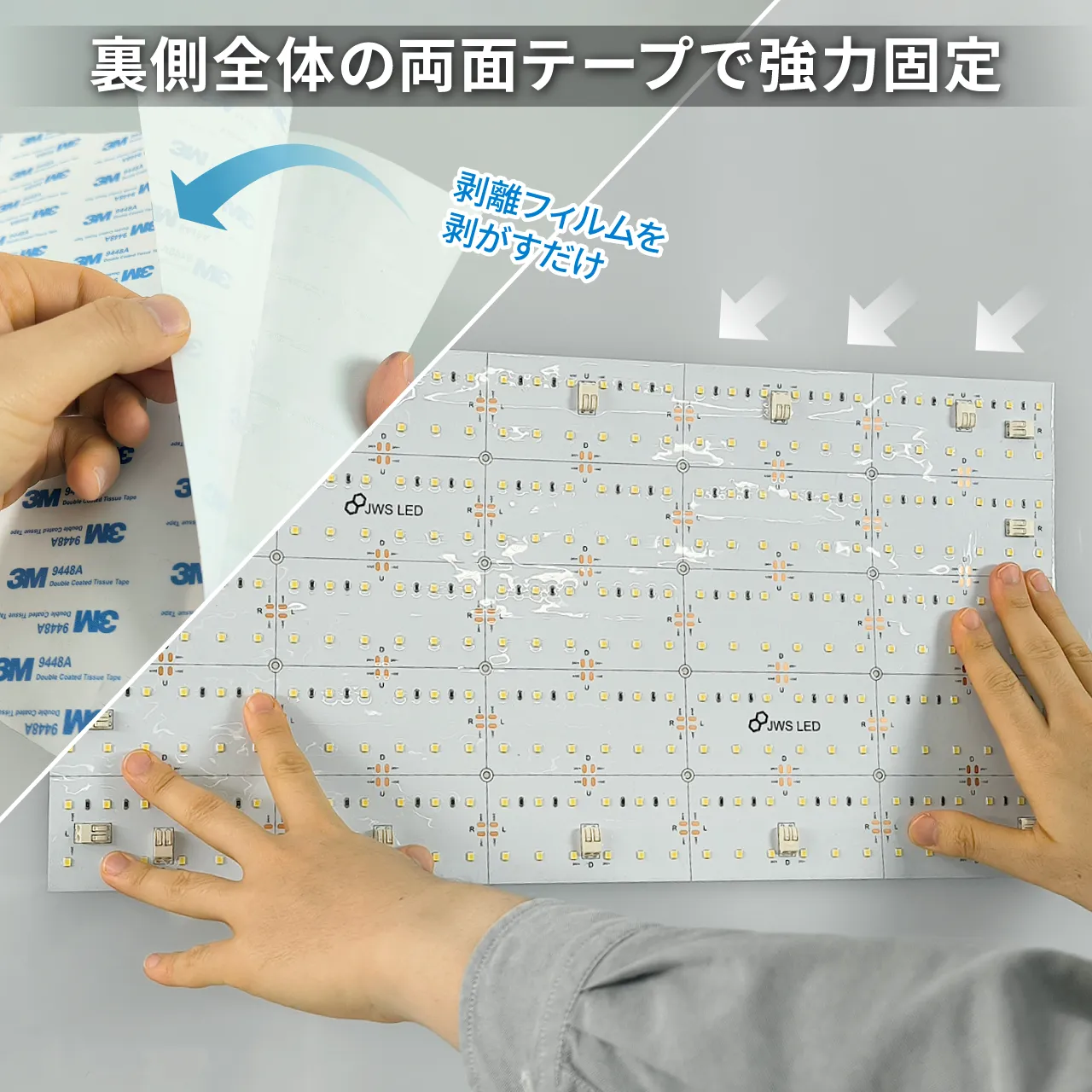 超高輝度、高発光効率のLEDチップを1ユニットに12個、1枚のシートライトで合計300個使用してります。シートライト1枚で4000lm以上を明るさを出します。一方で発光効率が良いので熱もあまり持たない安全設計となっています。 |