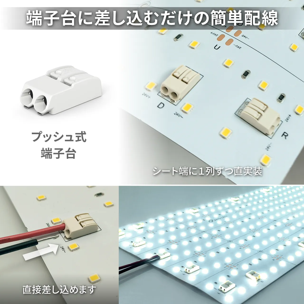 端子台の+と-は全て共通なので、どこからでも電源供給できます。シート同士を端子台の配線で連結して点灯エリアの拡張もできます。