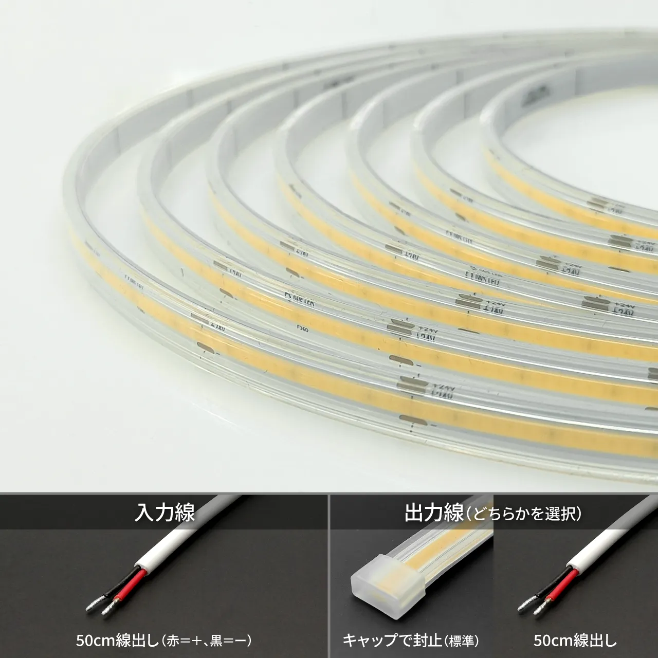 - 入力:線出し(防水ケーブル 50cm)・出力:キャップで封止 ※標準