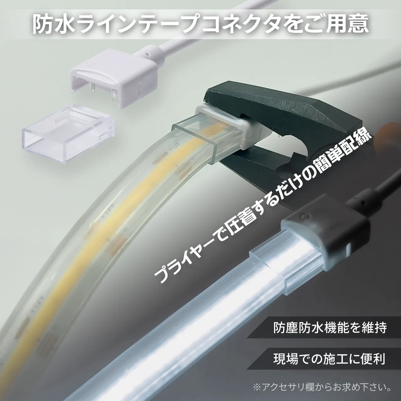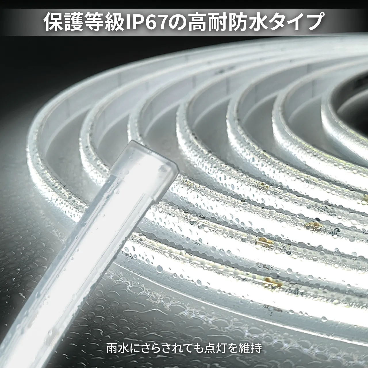 LEDラインテープF360と透明シリコンチューブを一体化した高耐防水タイプです。専用押出機を用いた製造工程により、シリコンの中でLEDテープがズレる心配がありません。厚さ1.5mmのシリコンによる高い防護性が最大の強みで、保護等級はIP67を誇ります。点灯の明るさや色味を一切損なうことなく雨水や埃の侵入を完全に遮断します。